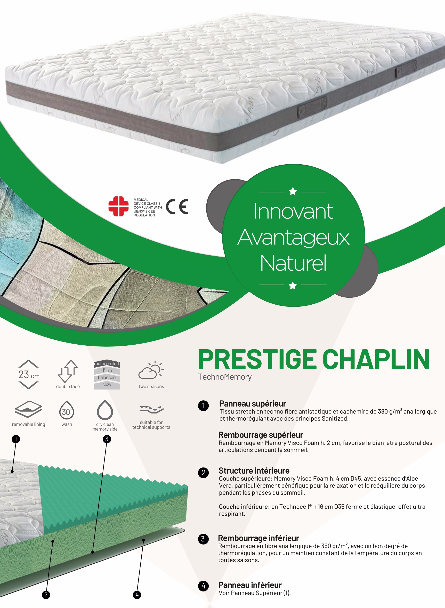 Rembourré de chaque côté de mémoire forme visco végétal de 2 cm de 55 kg/m3, permettant d’avoir moins de pressions sur le corps diminuant ainsi les différentes douleurs physiques.